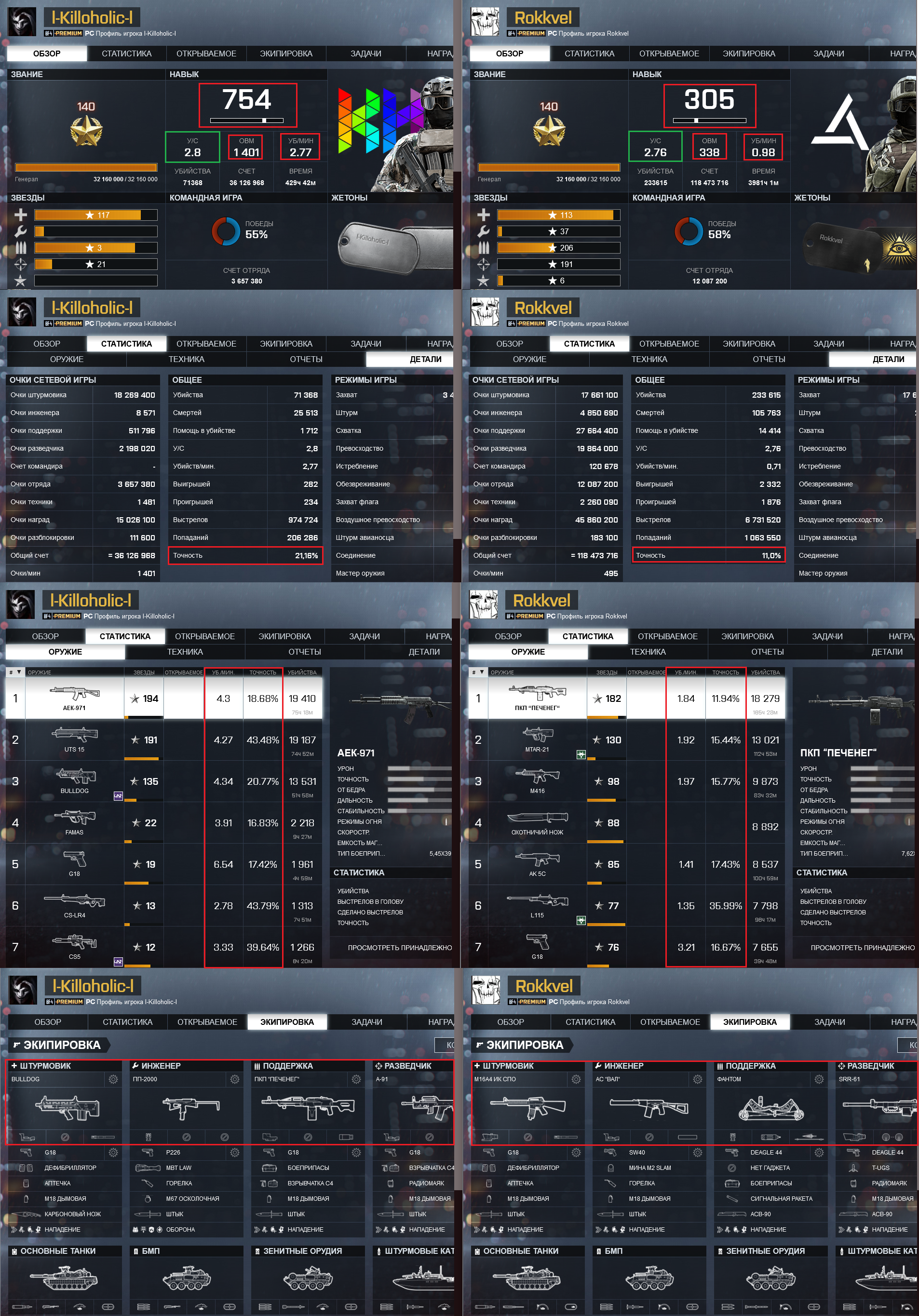 Сравним просто основные показатели. Навык, кол-во убийств в минуту, точность (общая и оружия) + посмотрим кто из вас с чем бегает и какие аксессуары на оружии предпочитает.